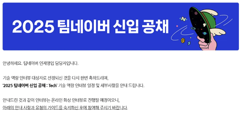 이번에는 그동안 쌓아온 경험과 성장을 바탕으로, 보다 전략적으로 그리고 가능한 많은 기업에 지원해 보려 노력했다. 그 과정에서 네이버 2025 신입 공채 1차 면접 기회를 얻을 수 있었고, 결과와는 별개로 이 과정에서 무엇을 준비했고 어떤 질문을 받았는지, 어떤 아쉬움과 배움을 얻었는지를 기록해두고 싶었다.