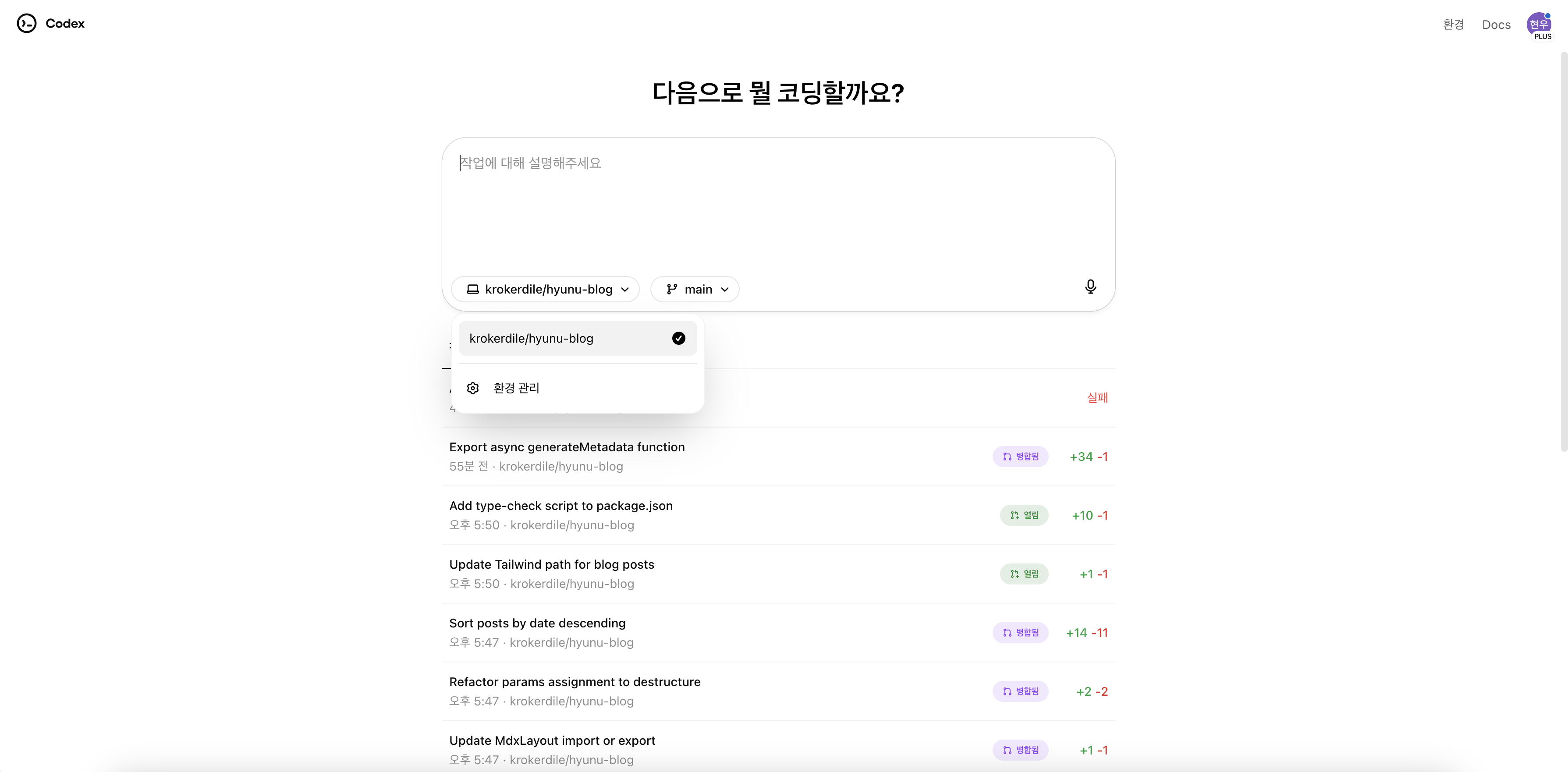 레포지토리를 선택하면, Codex는 해당 브랜치(main, develop, 혹은 feature/*) 기준으로 변경 사항을 추적하고, 대화창에 입력한 자연어 요청을 기반으로 코드 생성/수정/리팩토링/문서화/PR 작성 등의 작업을 직접 수행해줍니다.