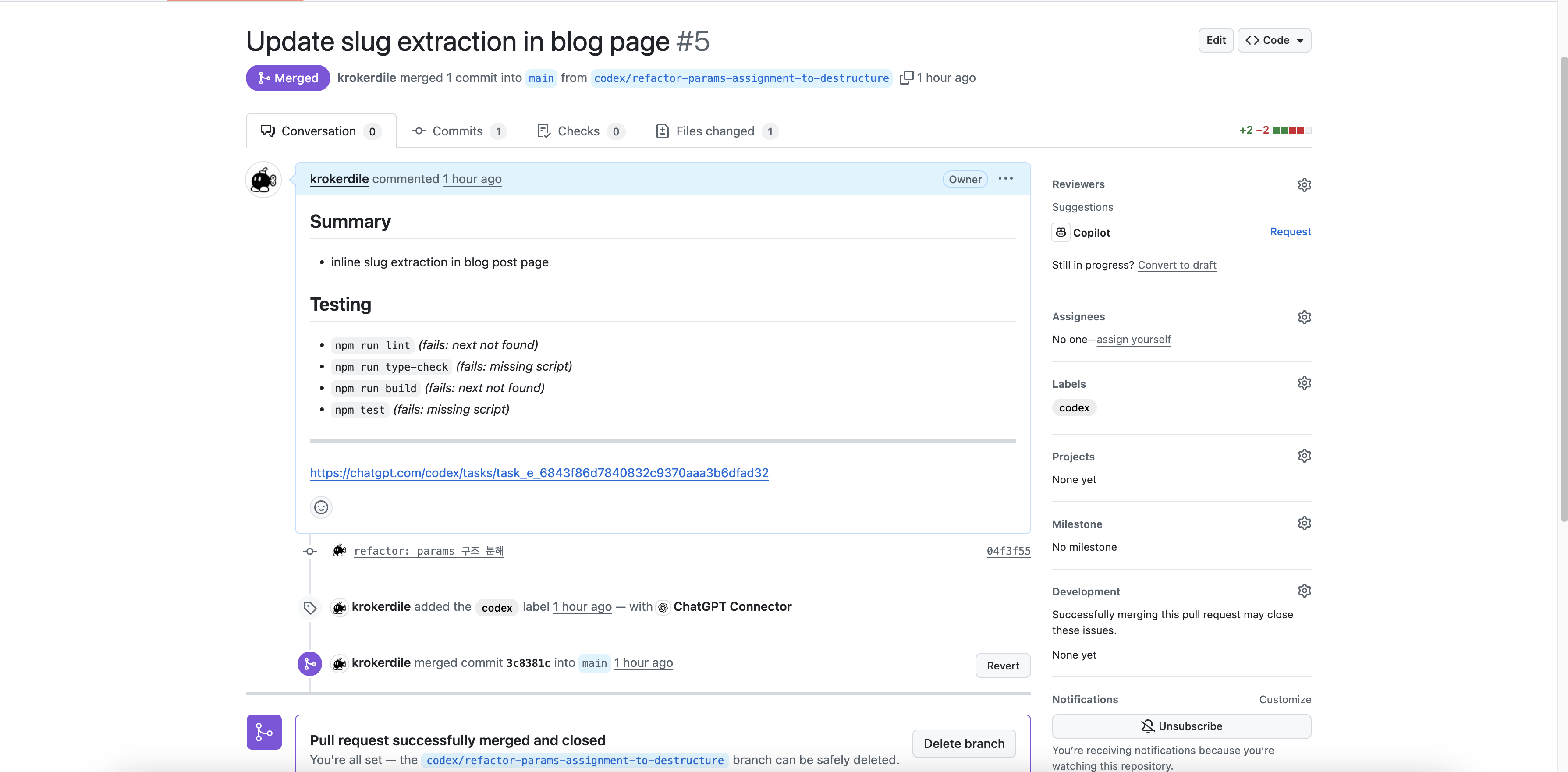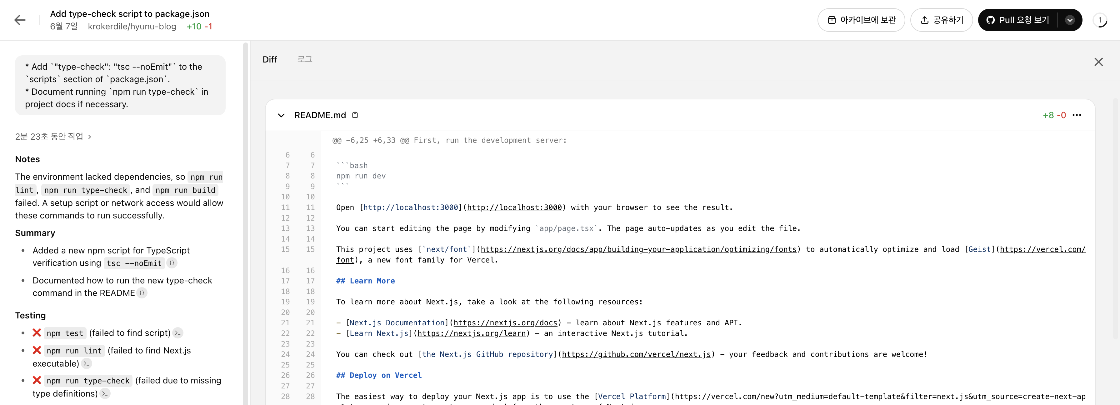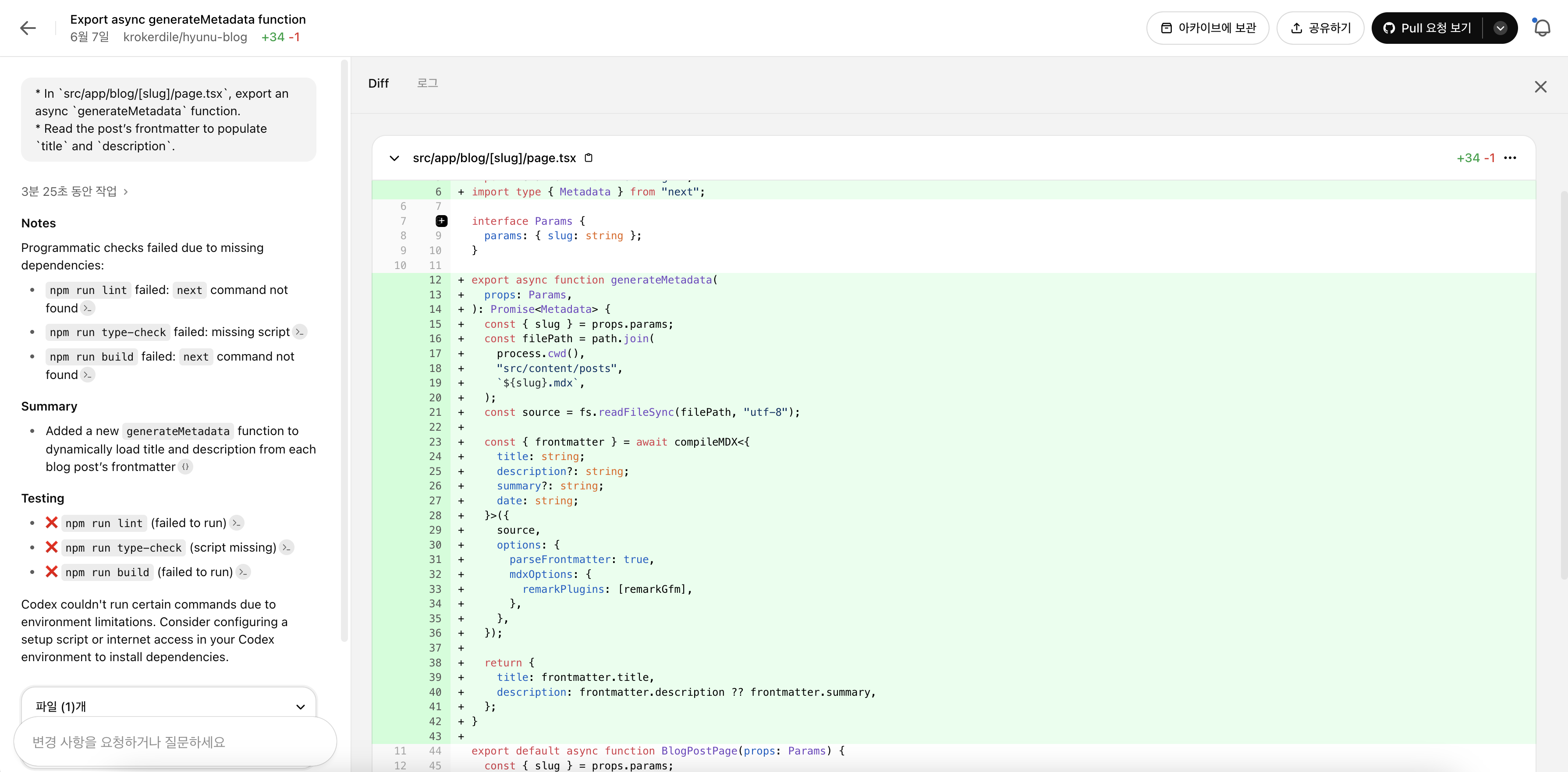 실제로 위와 같이 pr 까지 완료하면 작업 내용이 반영이 되는 것을 확인할 수 있었습니다. 아쉬운 점이라고 한다면 제가 agents.md에 작성을 해뒀음에도 불구하고 PR 내용이 제가 원하는 템플릿대로 작성이 안되는 것 같아서 이 부분은 추가로 찾아서 반영을 해봐야 될 것 같습니다.