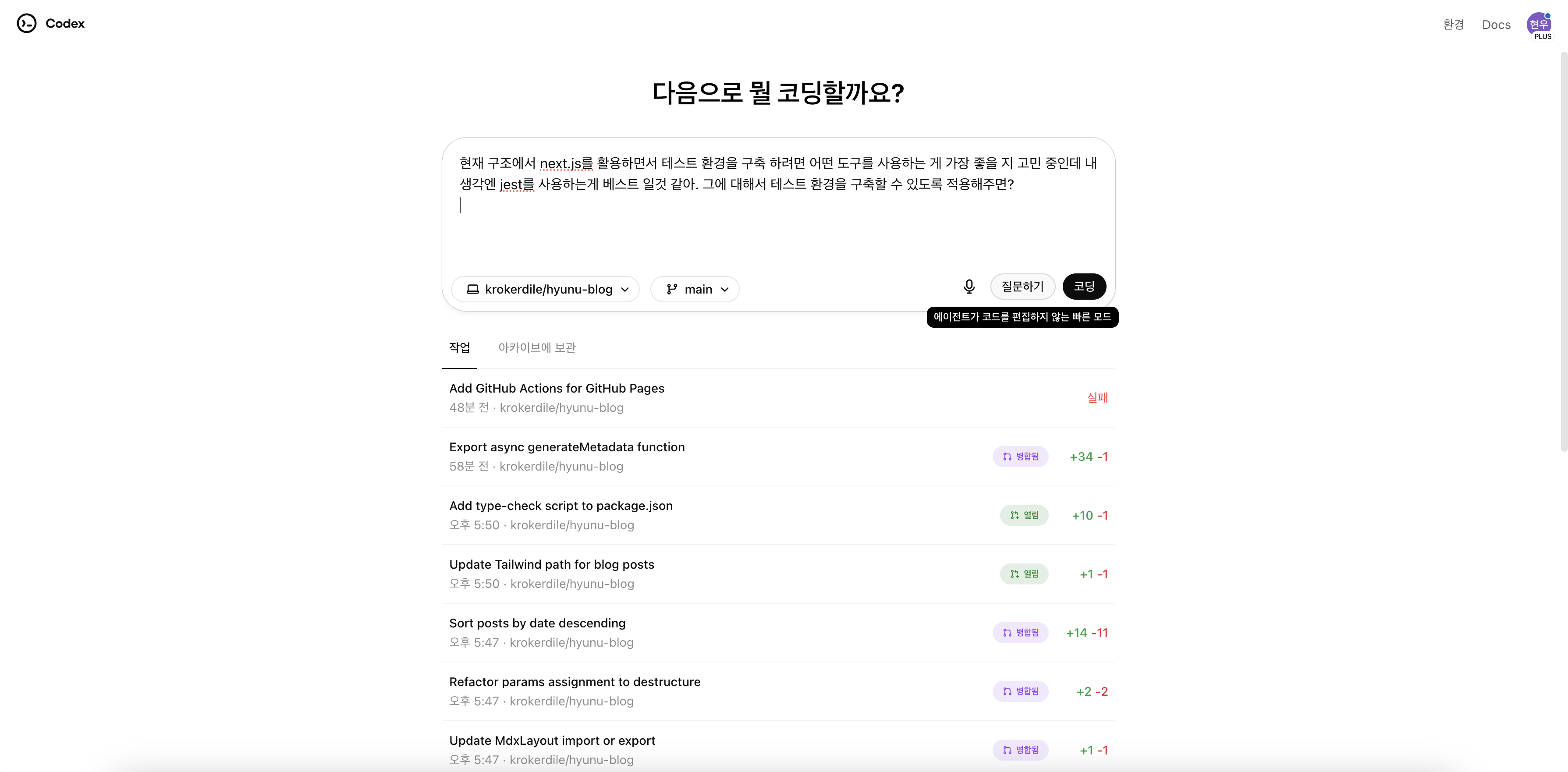 요즘 "AI로 못하는 게 없네"라는 말이 익숙해졌습니다. Cursor나 Claude Code처럼 AI가 개발에 자연스럽게 녹아든 도구들이 하나둘 등장하고 있고, 저 역시 그 흐름 속에서 OpenAI의 Codex를 알게 되었습니다. 마침 개인 블로그 프로젝트를 시작하던 참이라, 실험 삼아 Codex를 직접 써보기로 결심했습니다.
