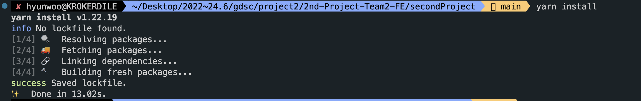 기본 package.json을 바탕으로 라이브러리를 설치할 수 있도록 "yarn install"을 해주면 일단 프로젝트 생성은 끝이다.